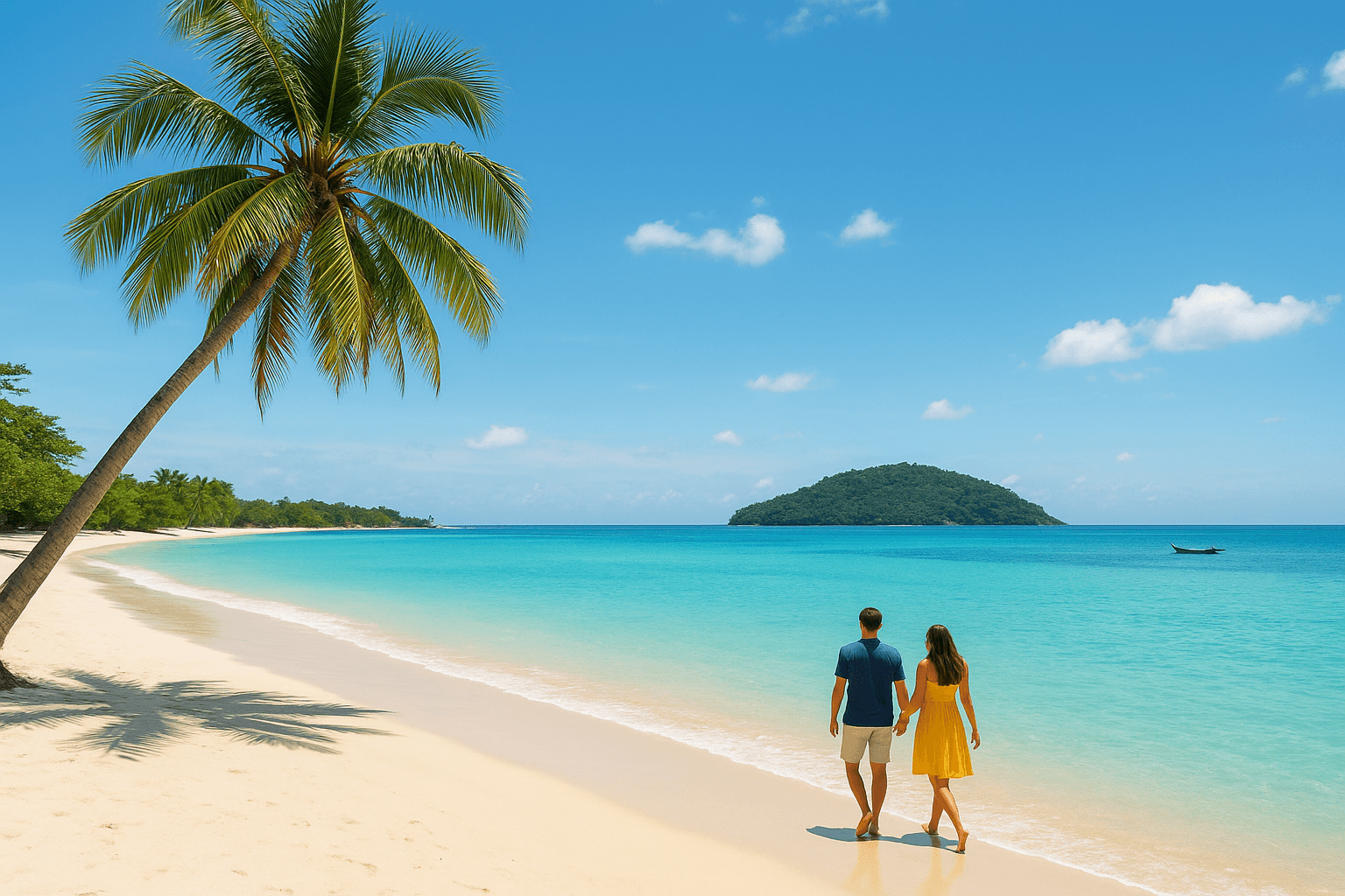 Panorama pantai Indonesia dengan air laut toska, langit cerah, pasir putih, perahu kecil di kejauhan, dan wisatawan berjalan di tepi pantai saat golden hour — menciptakan suasana liburan akhir tahun yang hangat dan alami